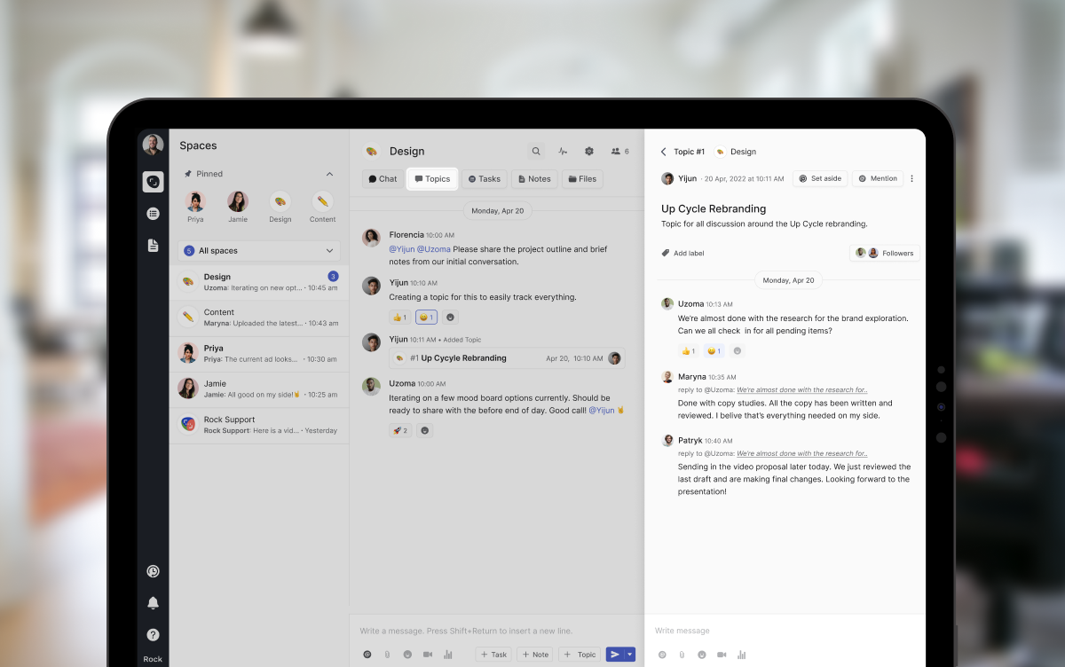 Ask all of your team members to write their weekly to-do’s on topics in Rock. By including all of the things that need to be completed in a centralized location, such as the topic, you can stay in the loop with the rest of your team.