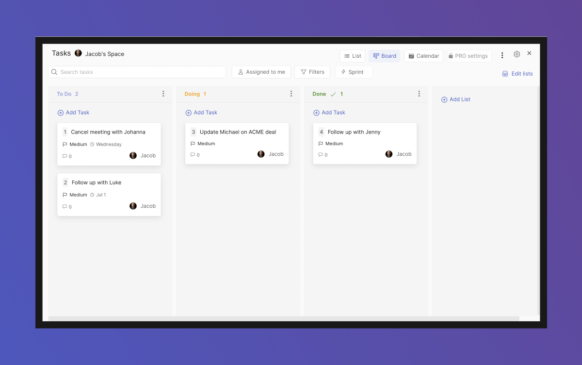 Sprints allow you to group tasks by time cycles (pick any timeline such as weekly, bi-weekly, or monthly). This way you can rest easy knowing that everything you need to do in that period is in your sprint.