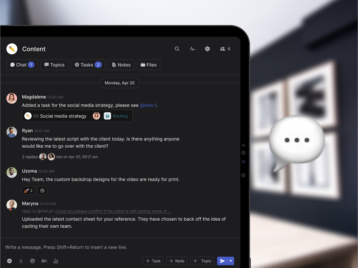 Using task management alongside messages is an effective way to get work done. Tasks are a more organized way of communicating and reduce the number of notifications you receive compared to messages.