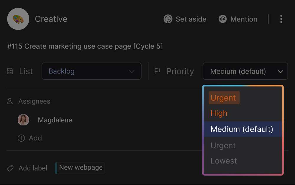 Now that you have made your selection of tasks, it’s time to rank them on urgency. This allows your team to focus on the key matters at hand. A dedicated toggle allows us to configure task priority as: urgent, high, medium, low and lowest.