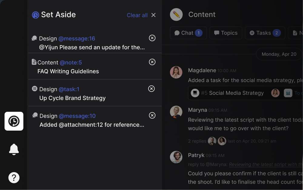It is often easier to keep priorities in a dedicated panel so you’re not distracted with other tasks. This is exactly why we introduced Set Aside a while back. With internal and external projects in one place, we often have tasks scattered across spaces and boards. To avoid context switching within the app, we access prioritized tasks directly from this panel.