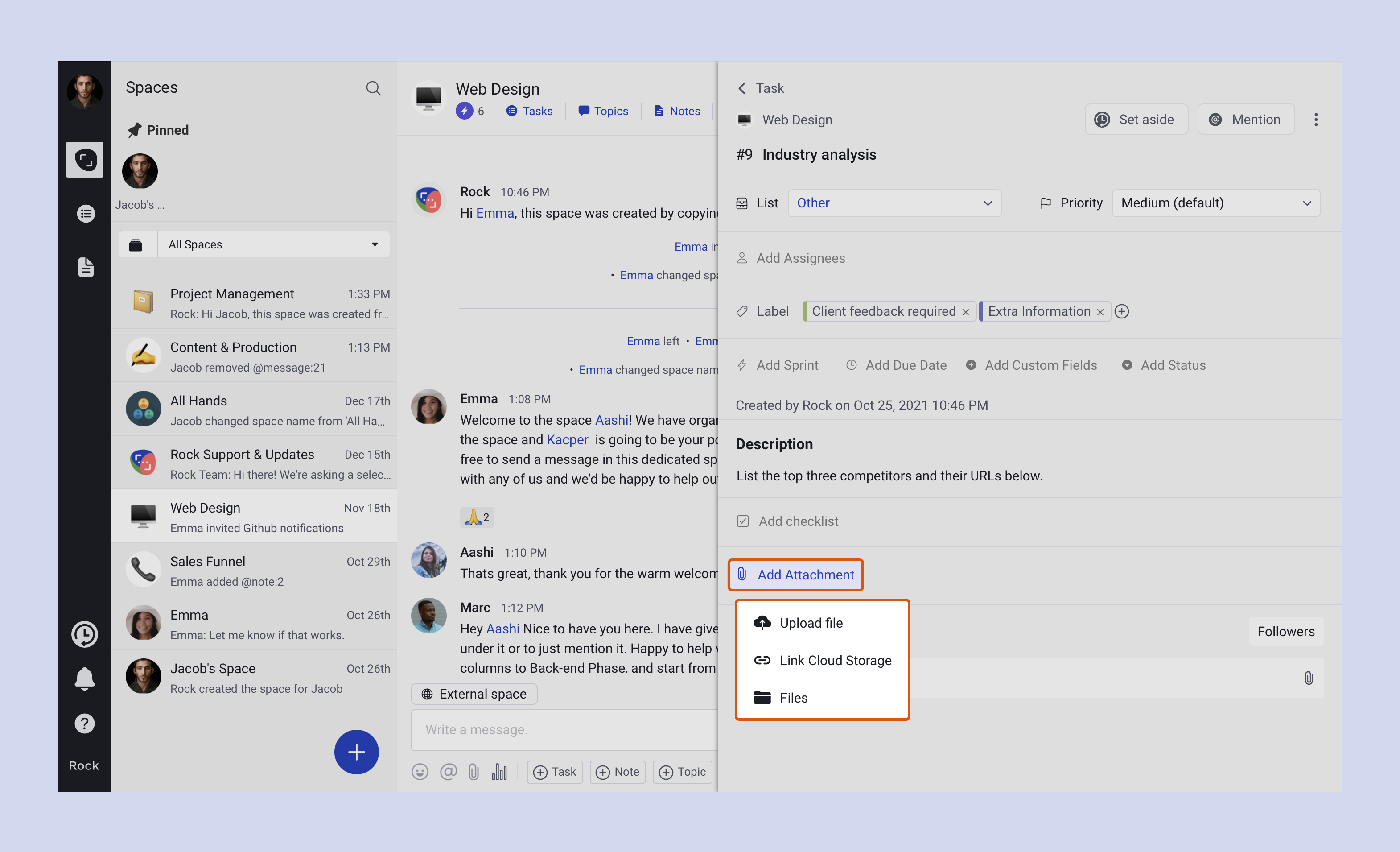 Attach a design file on Figma to a product design task in a space and make a creative review easier, or add a spreadsheet on Google Drive to a data analysis task to make sure everyone has access to the latest. Just one more way to bring everything together in one space!