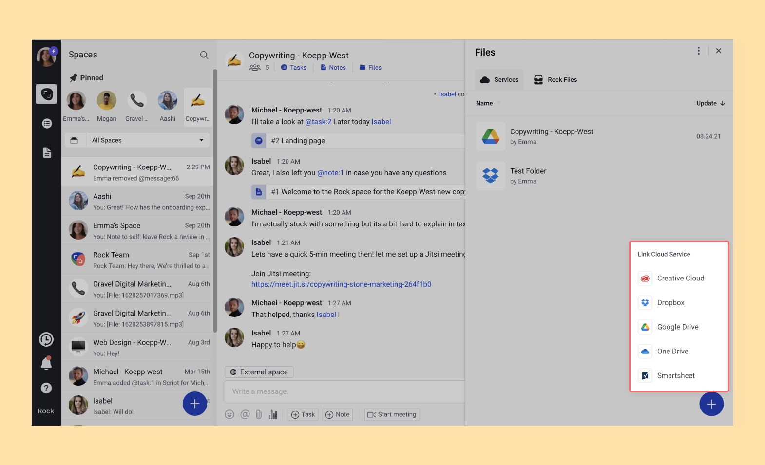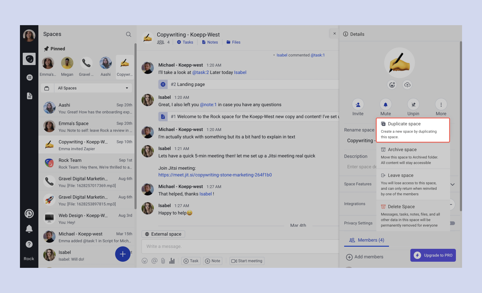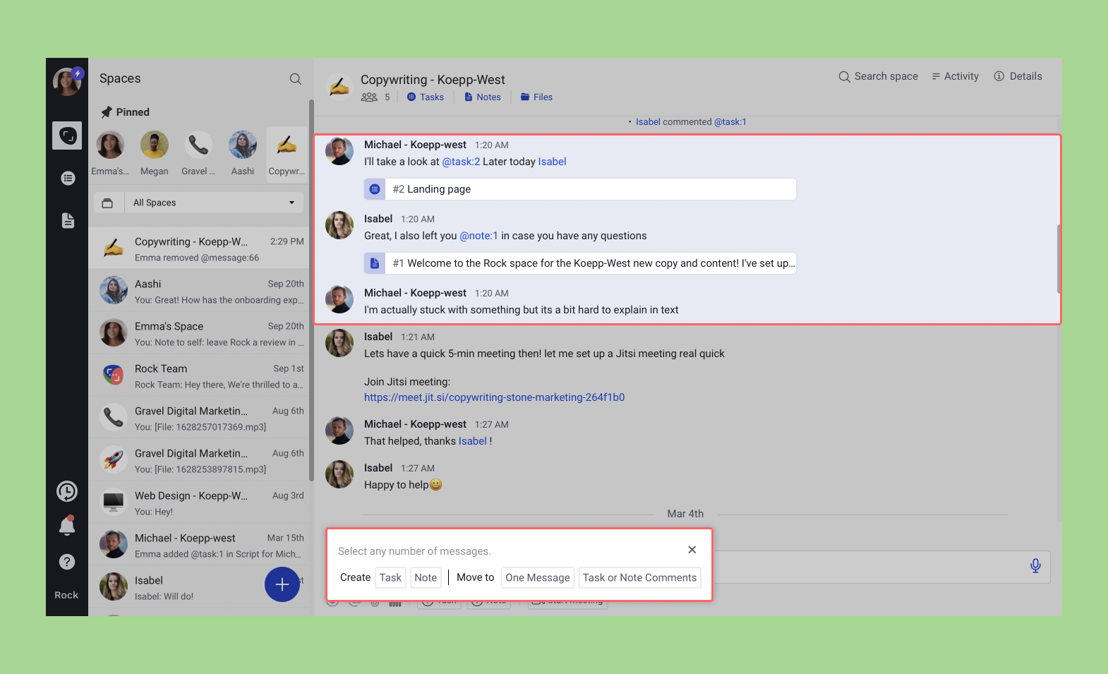 Even though Rock is asynchronous by default, most of us still send messages to discuss certain things. The problem with these messages is that they can easily get lost in a space and if they are related to a specific task or note it’s difficult to refer to them.