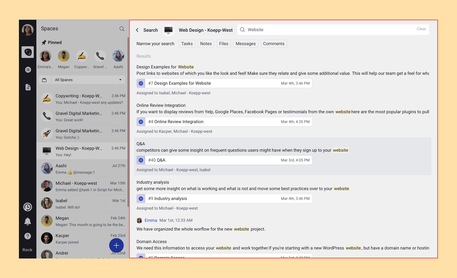 Space search is now available on web and desktop! Find conversations, tasks, labels, notes by searching for specific keywords or other search terms in each space.