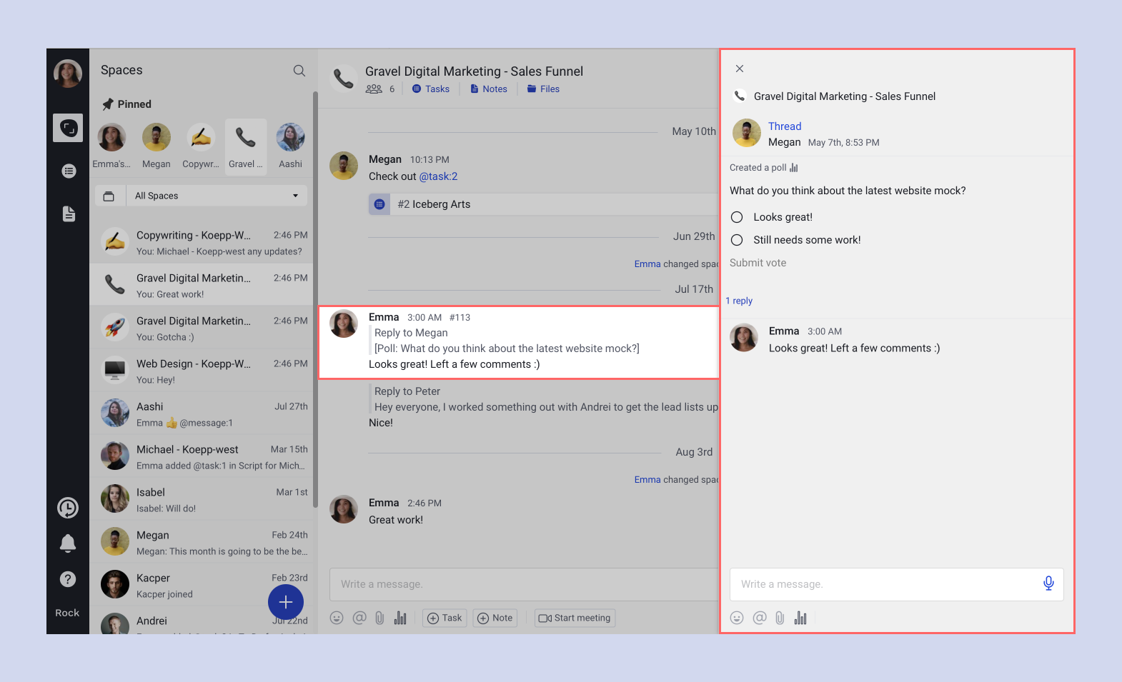Keep conversations in one place by replying directly in a thread! You will be able to easily keep up with all messages and respond right away. Add reactions, @mentions, polls and more within the thread just like in regular messages.