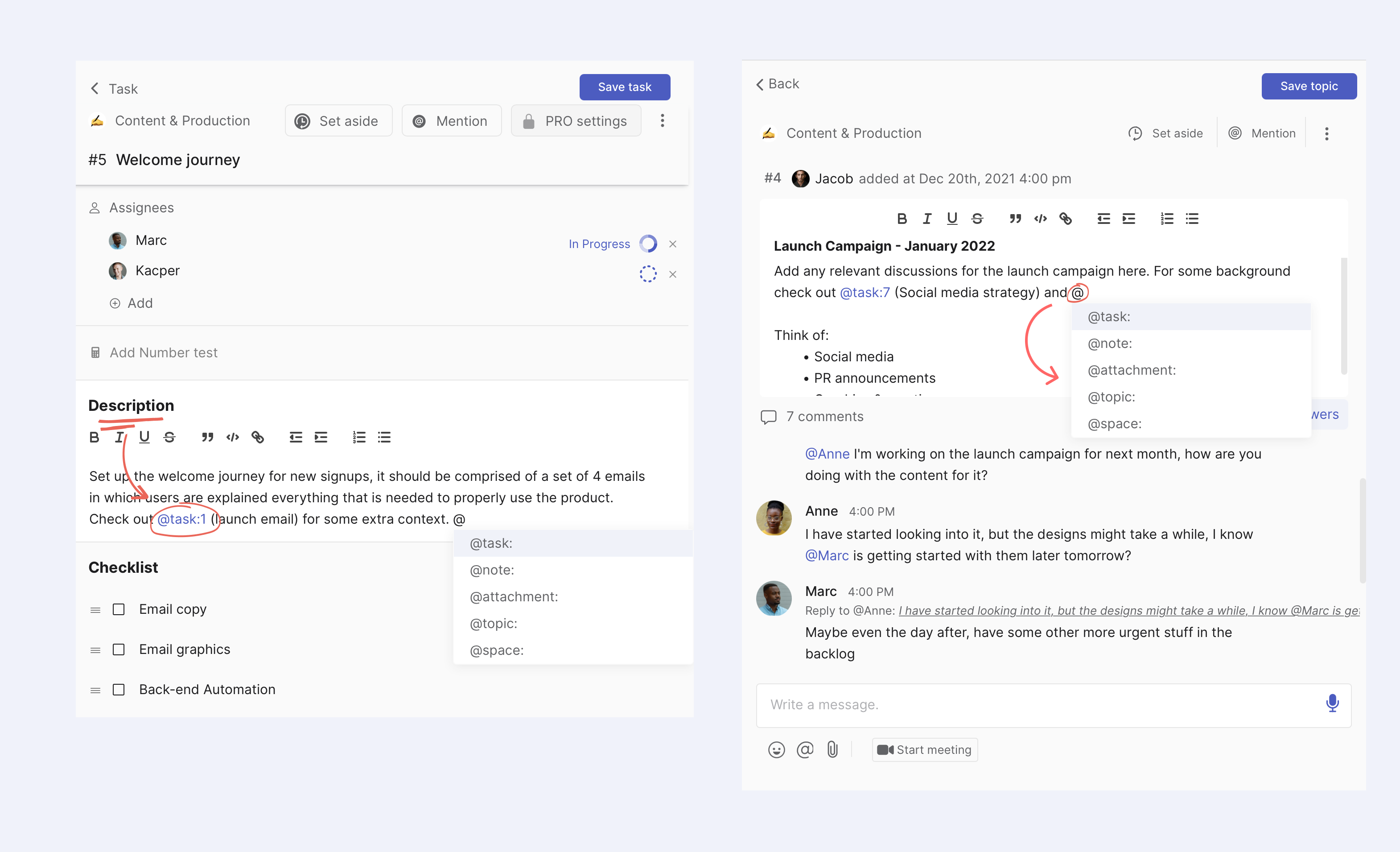 Include important information, add relevant context and truly connect the work you are doing across projects. Curious to try it out? The only thing you have to do is write an @ in the description of any task, note or topic to get started.