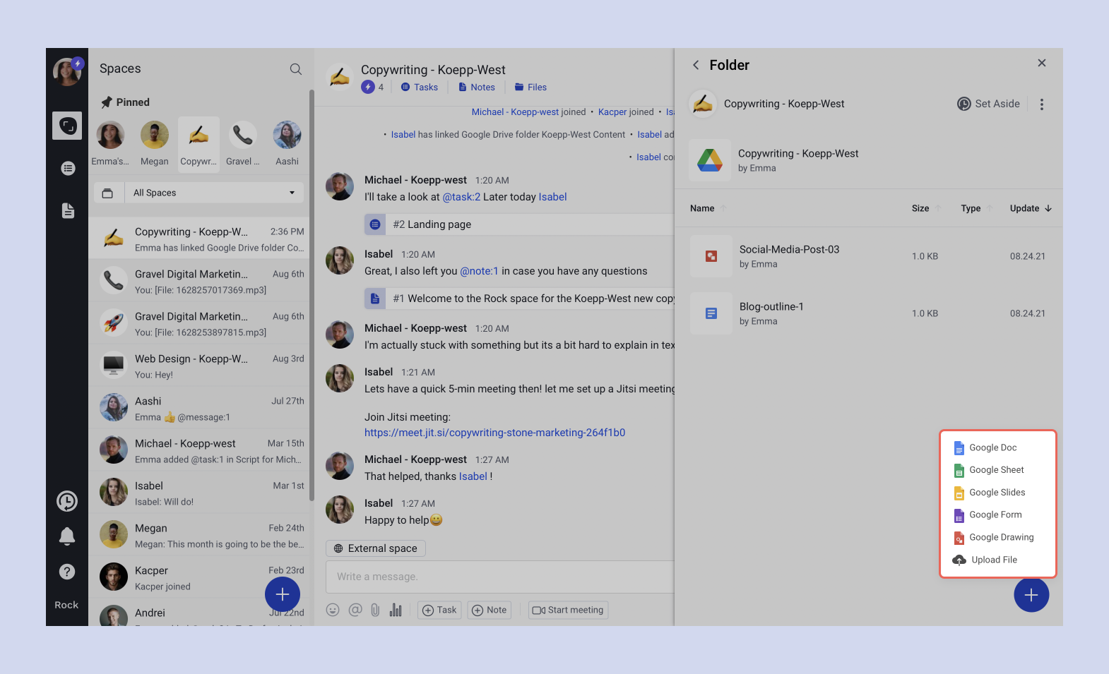 In the coming weeks, you will be able to link your Figma, OneDrive, DropBox, and Adobe Creative Cloud documents to a space and the Files mini-app. This way you can more easily access all your cloud files and have them available to team members, partners and clients all from the same space.Stay tuned to our blog and different social media channels for the latest information on product releases!
