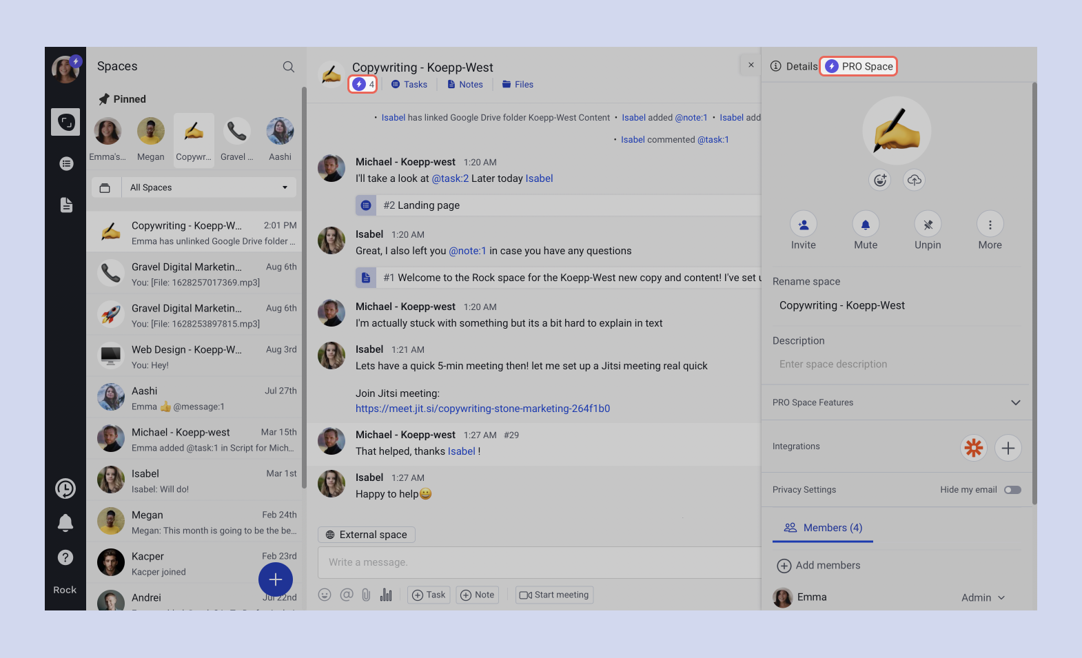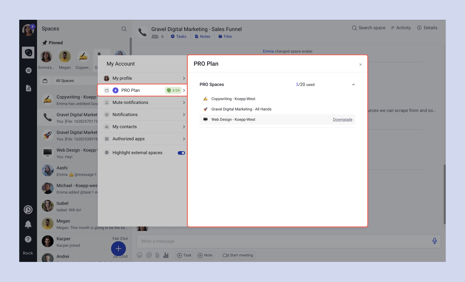 The PRO plan allows you to upgrade up to 20 spaces and add functionality, integrations and more that make Rock even more useful. Anyone in a space will be able to use PRO features even if they haven’t purchased PRO themselves.