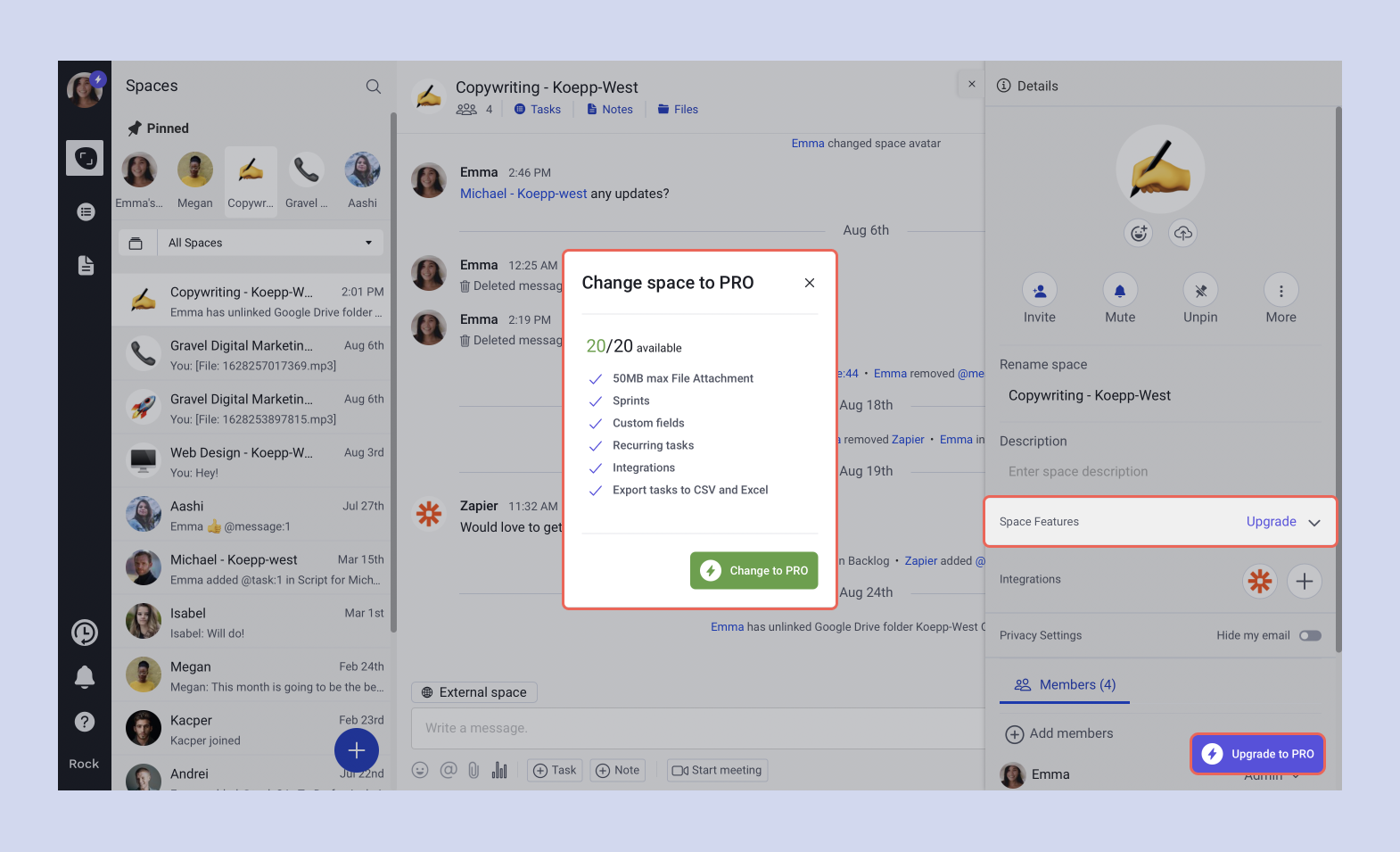 Pick and choose which spaces you want to upgrade or downgrade depending on new projects, teams, partnerships or clients.