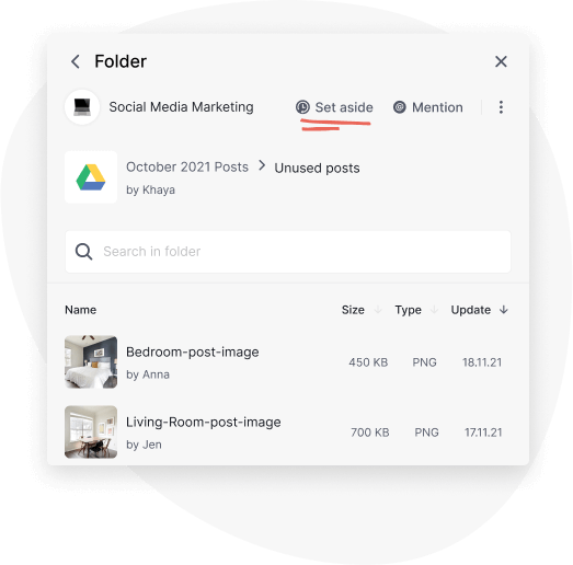 - Set Aside folders: If you need quick access to a folder in your Google Drive that is connected to a Rock space you can set aside the complete folder. This way you can seamlessly access the folder without having to go looking. You can set aside folders by pressing "Set Aside" on the top right corner of the folder view in the files mini-app.