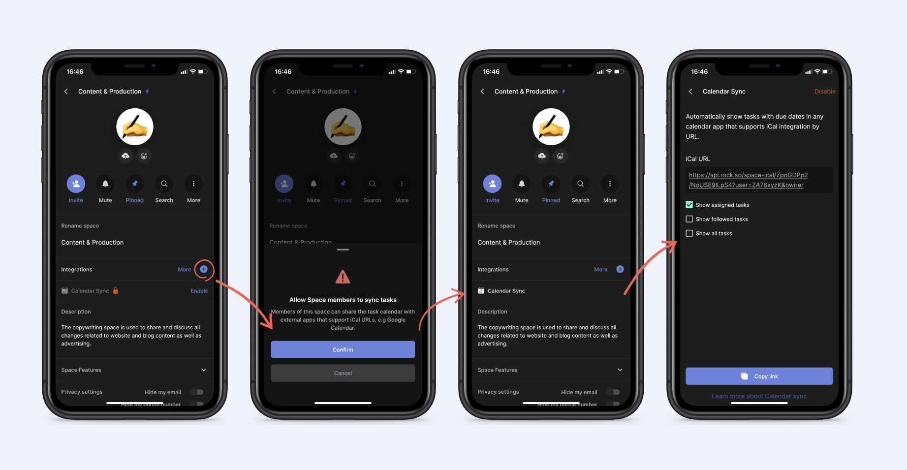 - Confirm ? Calendar Sync. Note that you can always disable the feature in the future through ⚙️ Space Settings.