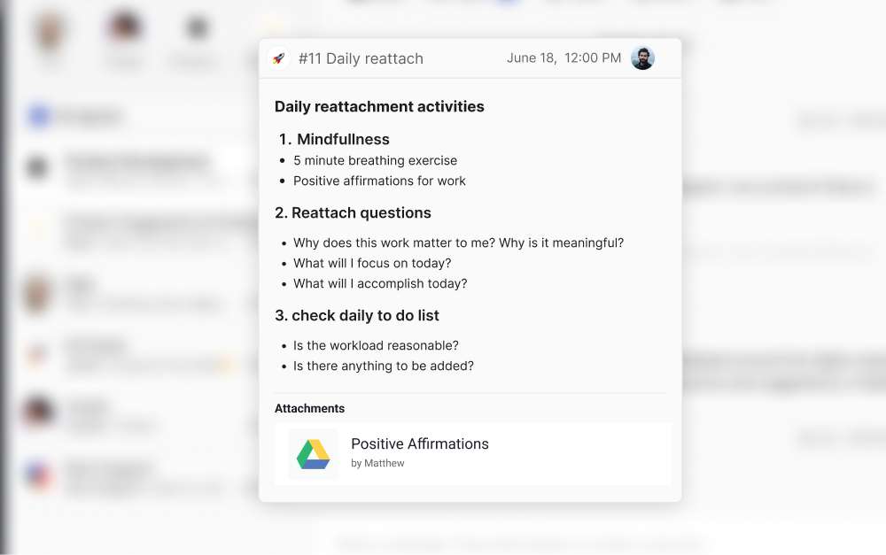 What if we told you that a UC Berkeley study found that completely detaching from work worsens productivity? People who have mentally prepared and thought about the upcoming workday are more productive. By "reattaching" to work, they can start their day more aligned with their goals.