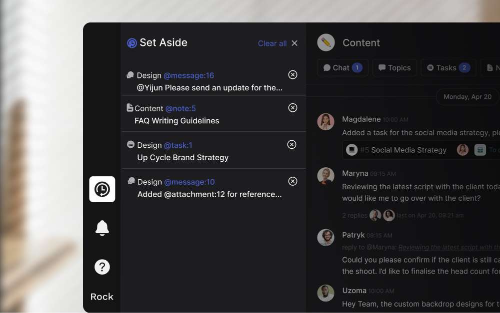 No more distractions such as unnecessary messages, calls, and meetings. Organizing your tasks beforehand helps you have a productive morning. To make your task management time-efficient, use the Set Aside feature on Rock.