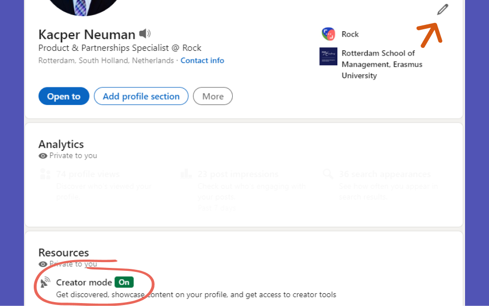 - Head to your profile, make sure your Creator mode is turned On, and click on the Edit symbol.