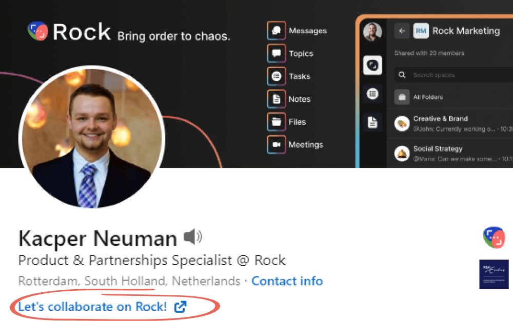 Including an easier way to get in touch with you on LinkedIn can lead to stronger connections. LinkedIn is an important place for you to find clients, partners, and suppliers. By including your Quick Connect in your bio, you can provide them with an easy way to start discussing and collaborating with you. You won’t need to transfer from LinkedIn messages to email to a collaboration tool. With Quick Connect you can directly start working in a space.