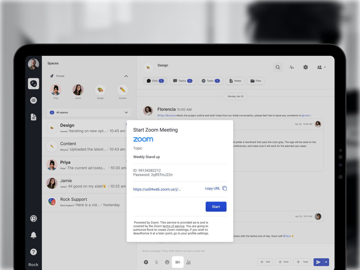 With Rock’s messaging feature, you can chat with everyone in a space or tag a team member to ask them something directly while still enabling the rest of your coworkers to see their answer. This helps to prevent information from being siloed while freeing everyone to focus on their work.